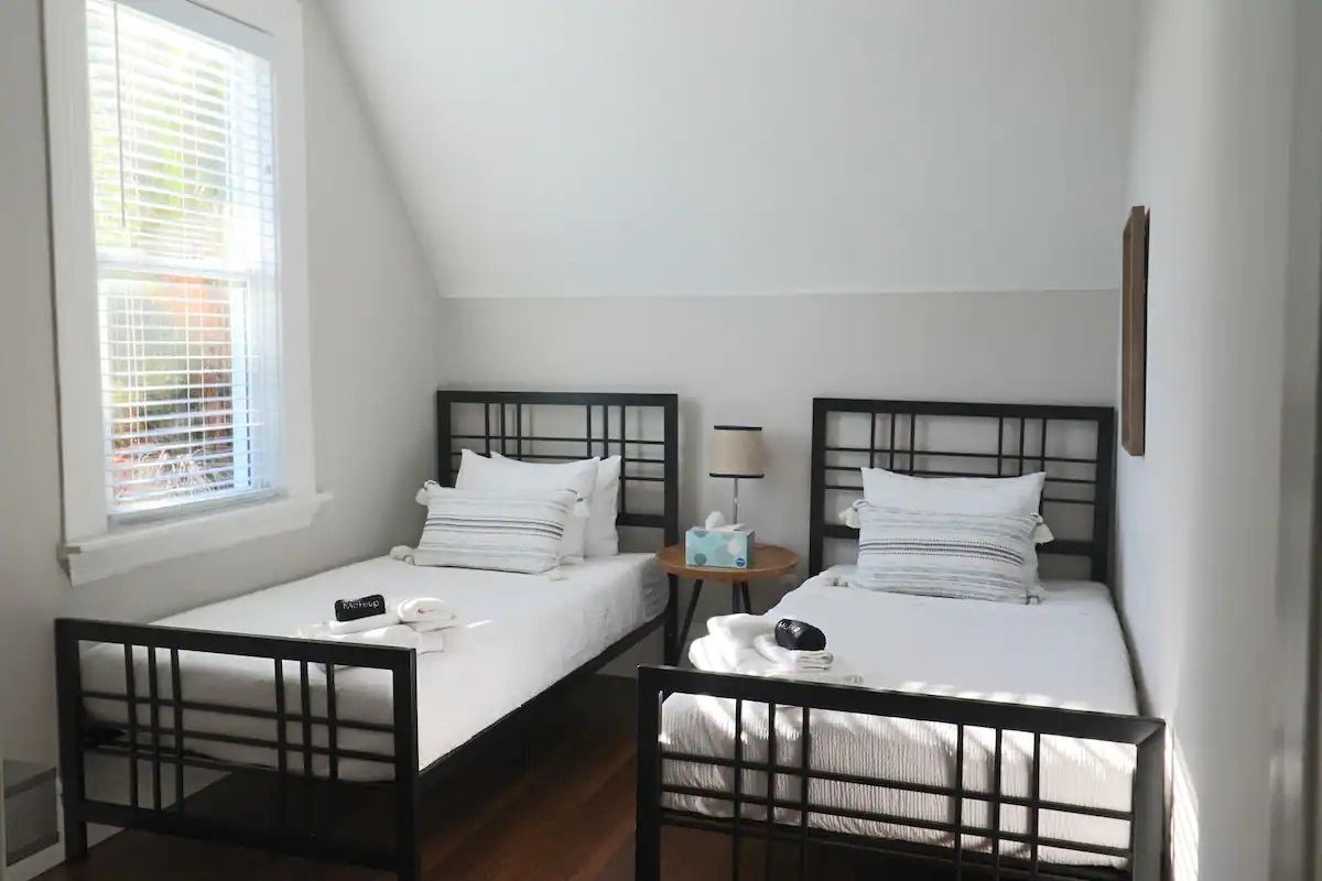 Bedroom 4 (Upstairs): Two twin beds, upstairs, shared bathroom — great for friends or siblings wanting their own sleeping spaces.