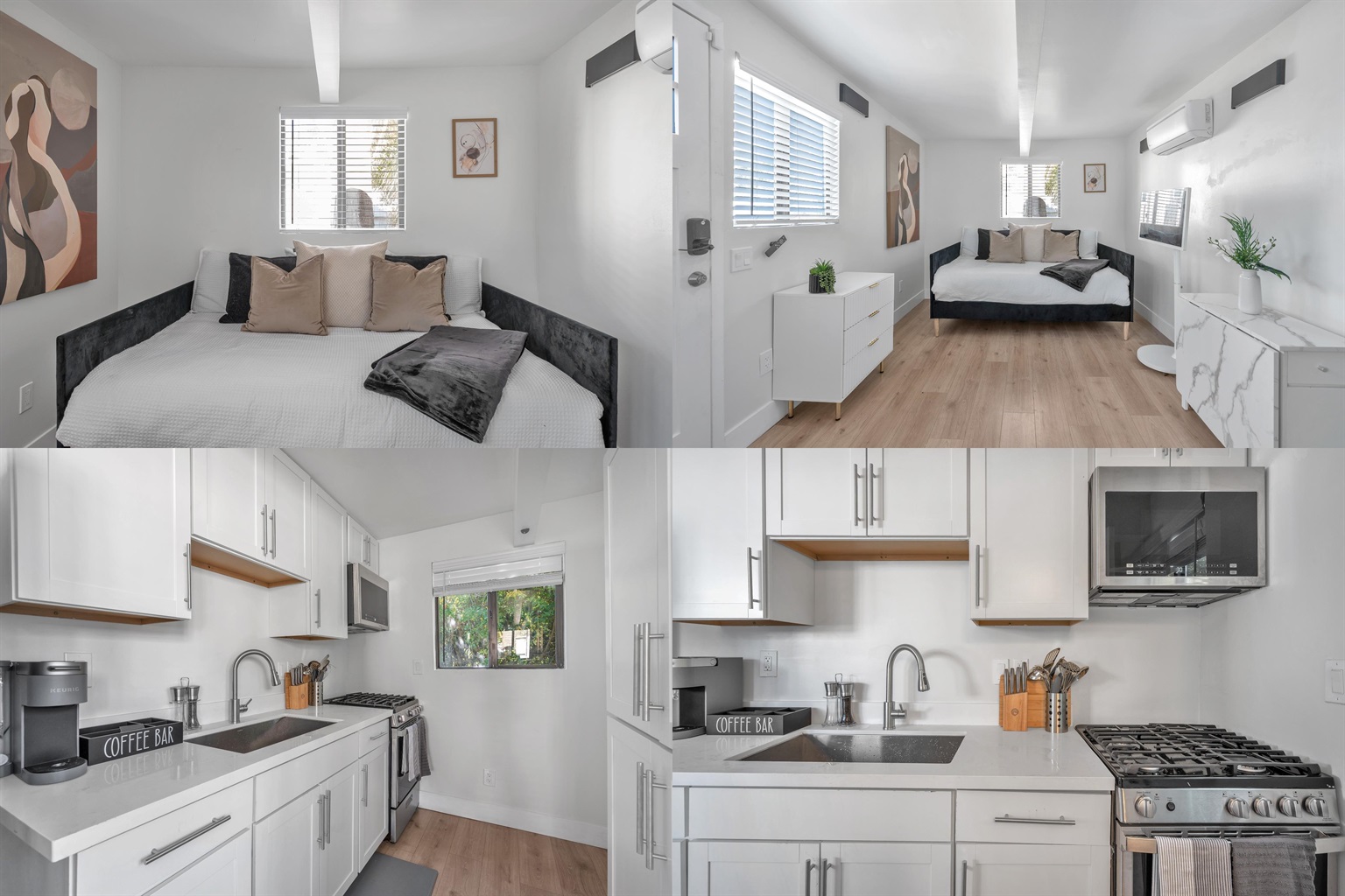 The modern kitchenette is fully stocked with all the essentials to make cooking a breeze — gas stove, microwave, refrigerator, Keurig coffee maker, blender, and toaster. A sleek white design and marble accents make it feel fresh and upscale.